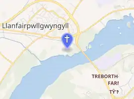The village of Llanfairpwllgwyngyll is named after St Mary's Church.[3] The long form of this name, Llanfairpwllgwyngyllgogerychwyrndrobwllllantysiliogogogoch, was first adopted in the 19th century as a promotional device.[4] In English, the first and older element of the name means "The Church of St Mary at Pwllgwyngyll [the white hazel pool]".[4] The second part translates as "near the rapid whirlpool, near St Tysilio's red cave", Llandysilio being the name of another local parish.