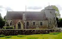 The churchyard is very large, reflecting the size of the parish.[1][12] Burials include Catherine Matcham, one of Lord Nelson's sisters;[15] and a table-tomb dated 1615 is one of the oldest such graves in Sussex.[1] There are also wooden graveboards, sometimes used as a cheaper alternative to gravestones,[16] and a pair of gate-like iron grave-markers.[1] The lychgate at the north entrance was erected in 1903.[6] A very broad yew tree, known to be over 600 years old, occupies part of the churchyard behind the church.[1]