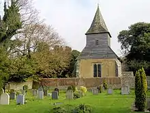 The plan of the church consists of a nave with a north porch, a south aisle, a north transept, and a chancel.[3][9] The walls are of flint with small areas of rendering, and are in good structural condition.[2] Although very thick, the window openings are splayed to allow more light in.[4] At the west end of the church is a "pretty" weatherboarded bellcote with a shingled broach spire.[3][5][9] The chancel is Norman, with two original round-headed windows, a carved triangular string-course and traces of a round-headed south doorway.[2][8][9] The nave windows are in Decorated Gothic style, and the east window is Perpendicular Gothic. There is evidence of blank arcading around some of the windows—a feature also seen at St Michael and All Angels Church in nearby Little Horsted.[5] The high chancel arch, inserted by Paley and Austin, is in 13th-century (Early English Gothic) style.[2][5][8] There is also a king post roof.[5]
