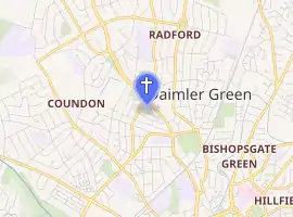 The previous church was built to the designs of George Taylor of Coventry, as a chapel of ease to Holy Trinity Church, Coventry and consecrated on 29 September 1874 by Henry Philpott, the Bishop of Worcester.[2] It comprised a chancel with vestry on the north side, and a nave with the entrance porch at the west end of the south side. The nave was 68 feet (21 m) by 30 feet (9.1 m), the chancel 21 feet (6.4 m) by 20 feet (6.1 m). There was accommodation for 300 worshippers. The stone font was made by Mr Seager of Coventry. It was destroyed on 14 November 1940 during the Coventry Blitz and four of the fire watchers were killed. The destruction left only one course of stones standing. Some of the people seeking shelter in the church crypt were killed or injured.[3]