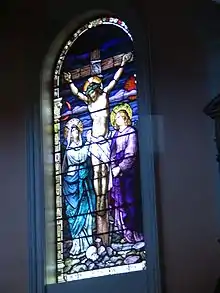 The interior features a large arcaded nave forming a clerestory with two side aisles and a large arch forming the entrance to the sanctuary. Walls are built in a succession of arches surmounted by a cornice of stone which forms part of the rooves of the aisles. Series of stone pilasters are ranged against the walls and on the sides of piers. The style of the capitals of the pilasters is Corinthian. The Basilica has retained its high altar (behind a modern one installed for the post-Vatican II liturgy) and features many fine statues. The 14 great stained glass windows (made by F X Zettler in Munich and purchased through H Credington & Co, Melbourne) represent the mysteries of the Rosary with one (the third sorrowful mystery, "The Crowning with Thorns") omitted.[2] The Sanctuary is dominated by a large oil painting by Giuseppi Brazi[3] of St Patrick and St Brigid interceding with Our Blessed Lady and her Divine Son.[2] The Stations of the Cross, which are of terracotta and framed in oak, were made in Paris in 1901.[3] Thomas Heffernan and his wife Margaret were significant funders of the church and they are notably memorialised in one of the windows.[4]