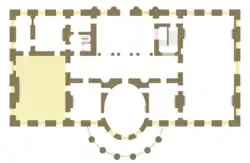 The northern third of what is now the State Dining Room was originally the western part of the Cross Hall. Two flights of stairs (one against the north wall, one against the south wall) led from the State Floor to the Second Floor. A single, central stair then led up to the Third Floor (then an attic).[1] Not completed when the White House was occupied in 1800, the Grand Stairs were probably finished by architect Benjamin Henry Latrobe in 1803 or shortly thereafter.[1] To the south of the Grand Stair was a small room, designated by Hoban for use as a Cabinet Room or President's Library.[2][3]