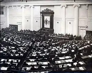 The State Duma or Imperial Duma was the Lower House, part of the legislative assembly in the late Russian Empire, which held its meetings in the Taurida Palace in St. Petersburg. It convened four times between 27 April 1906 and the collapse of the Empire in February 1917. The First and the Second Dumas were more democratic and represented a greater number of national types than their successors.[1] The Third Duma was dominated by gentry, landowners and businessmen. The Fourth Duma held five sessions; it existed until 2 March 1917, and was formally dissolved on 6 October 1917.