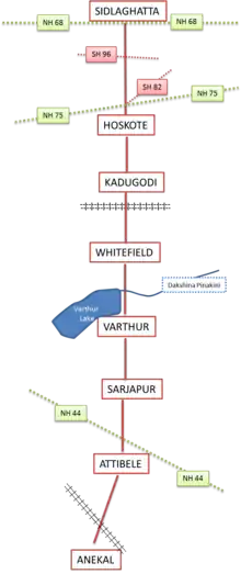 Karnataka State Highway 35, commonly referred to as KA SH 35, is a state highway running from Sidlaghatta (North) to Anekal (South) passing through Hoskote, Kadugodi, Whitefield,[3] Varthur, Gunjur, Sarjapur, Attibele.[1] Part of it is maintained by the Karnataka Public Works Department and a part by Bruhat Bengaluru Mahanagara Palike. Majority of the highway is 2-laned, except for the section between Kadugodi and Varthur-Kodi which is 4 laned.