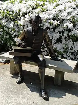 The Thomas Jefferson statue was a bronze public statue of Thomas Jefferson. The statue was located on a bench next to the Old DeKalb County Courthouse in Decatur, Georgia.[1] The statue depicts Jefferson writing the United States Declaration of Independence and was donated to the city by a private citizen to honor U.S. senator Paul Coverdell, who died in 2000.[2] Following a rally during the George Floyd protests on June 17, 2020, it was announced that the statue would be removed, citing the fact that Jefferson was a slave-owner who owned over 600 slaves and fathered several children with Sally Hemings, a slave he owned.[3] On the morning of June 19, 2020 the statue was removed at the request of the donor "to protect it from damage."[4] This came several days after the removal of the DeKalb County Confederate Monument, an obelisk on the courthouse grounds that honored the Lost Cause of the Confederacy.[2][3]