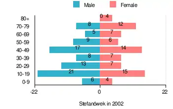 According to the 2002 Poland census, there were 163 people residing in Stefanówek village, of whom 53.4% were male and 46.6% were female. In the village, the population was spread out, with 21.5% under the age of 18, 38% from 18 to 44, 20.9% from 45 to 64, and 19.6% who were 65 years of age or older.[1]