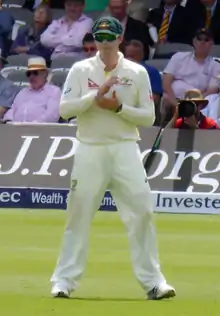 Smith made his Test debut at Lords in July 2010, playing both Tests against Pakistan in the 2010 Test series played in England.[20] He was selected mainly for his bowling, and batted down the order, although his bowling was not required in the first innings. In the second innings, he took 3 wickets for 51 as Australia won by 150 runs.[68] In the second Test he was called to bowl only ten overs and took no wickets, although he played an impressive role with the bat in the second innings. Batting with the tail, he scored 77 including nine fours and two sixes off successive balls, helping Australia to set a competitive target after having been bowled out for 88 in the first innings.[69]