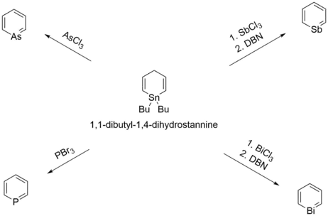 It is noted that other benzene derivatives with one carbon replaced with a group 15 element can be synthesized via a similar synthetic pathway to that which stibinin is synthesized. The reaction of 1,1-dibutyl-1,4-dihydrostannine with arsenic trichloride, phosphorus tribromide, or bismuth trichloride can yield arsabenzene, phosphabenzene, or 1-chloro-1-bismacyclohexa-2,5-diene respectively. Treatment of 1-chloro-1-bismacyclohexa-2,5-diene with a base, such as DBN, can yield the product bismabenzene.[3]