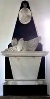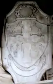 The East India Company erected a monument[7] to his memory of white and coloured marble by the sculptor William Tyler (1728-1801), situated in the north aisle of the nave of Westminster Abbey. His bust stands on a pedestal at the top, below which is a medal inscribed "Born March 6, 1697; died January 10, 1775". On the left side below is a winged figure of Fame holding an oval shield inscribed: "For Discipline Established, Fortresses Protected, Settlements Extended, French and Indian Armies Defeated, and Peace Concluded in the Carnatic". On the right side below is a female figure seated on a bale, representing the East India Company. She points towards Lawrence's bust and at her feet are shown various French and Indian flags. An heraldic escutcheon on the front of the pedestal shows the arms of Lawrence: Ermine, a cross raguly gules.[8] Further down on the pedestal is a panel containing a relief sculpted perspective of a city and an encampment, inscribed: "Tritchinopoly", which town Lawrence defended against the French from May 1753 to October 1754. The main inscription on the black marble base is as follows: