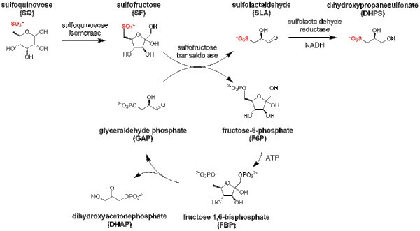 - The sulfofructose transaldolase pathway, first identified in Bacillus aryabhattai, involves isomerization of SQ to sulfofructose, and then a transaldolase cleaves SF to 3-sulfolactaldehyde (SLA), while the non-sulfonated C3-(glycerone)-moiety is transferred to an acceptor molecule, glyceraldehyde phosphate (GAP), yielding fructose-6-phosphate (F6P).[4]