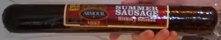 Summer sausage is an American term for any sausage that can be kept without refrigeration until opened. Summer sausage is usually a mixture of pork and other meat such as beef or venison, unless the product has the word "beef" in its name, in which case it only contains beef. Summer sausage can be dried or smoked, and while curing ingredients vary significantly, curing salt is almost always used. Seasonings may include mustard seeds, black pepper, garlic salt, or sugar.[1][2]
