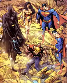 In the DC Comics' limited series Infinite Crisis, the other-dimensional Superboy-Prime watches Conner during his seclusion in the paradise dimension.[13][14][15] Along with Alexander Luthor, Jr., another survivor of the previous Crisis, they wish to reconstruct the DC Universe in their image after determining that the heroes they've been observing didn't meet their own standards of what heroism really was. Resentful of Conner, whom he claims has lower standards than his own despite a seemingly perfect life, Superboy-Prime attacks him, telling him that he should be his replacement as Superboy. Possessing an apparent strength advantage, Superboy-Prime pulverizes Conner, badly injuring him, until the Teen Titans, Doom Patrol, and Justice Society of America join the fray, leading to a climactic battle where various Flashes pull Superboy-Prime into the Speed Force.[16][17]