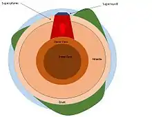 A superswell is a large area of anomalously high topography and shallow ocean regions. These areas of anomalous topography are byproducts of large upwelling of mantle material from the core–mantle boundary, referred to as superplumes.[1] Two present day superswells have been identified: the African superswell and the South Pacific superswell. In addition to these, the Darwin Rise in the south central Pacific Ocean is thought to be a paleosuperswell, showing evidence of being uplifted compared to surrounding ancient ocean topography.[2]