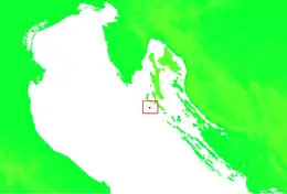 Located in the Kvarner Bay and southeast of the Istrian peninsula, the Croatian island of Susak is 7.4 kilometers (4.6 mi; 4.0 nmi) southwest from the island of Lošinj,[3] 10 kilometers (6.2 mi; 5.4 nmi) south of the island of Unije, and 120 kilometers (75 mi; 65 nmi) east of the Italian coast. Susak is about 3 km (1.9 mi) long and 1.5 km (0.9 mi) wide, and covers an area of approximately 3.8 square kilometers (1.5 sq mi).[4] Susak's highest elevation point, Garba is 98 metres (322 feet) above sea level.[1][3]
