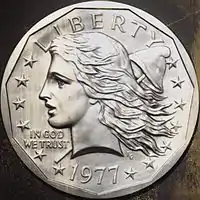 Chief Engraver Gasparro was tasked with creating a design for the proposed coin. His obverse design depicted a bust of Liberty, while his reverse depicted a soaring eagle.[19] The bust was pictured along with a pole, atop which sat a Phrygian cap, a symbol used to represent freedom.[19] Gasparro's Liberty design was based on a similar obverse that he created for a 1969 American Numismatic Association convention medal.[19] The reverse, depicting an eagle flying above a mountain against the rising sun, was originally created by Gasparro in 1967 for a proposed commemorative half dollar.[20] Describing the reverse design, Gasparro stated that it was meant to symbolize "a new day being born".[21]