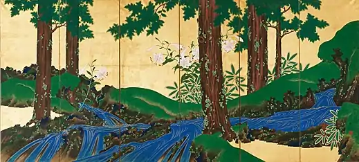 Mountain Stream in Summer and Autumn is a pair of six-panel byōbu folding screens made by Kiitsu using ink and color on gold-foiled paper.[9] It depicts "a scene of mountain streams flowing through cypress groves highlighted by lilies and a cherry tree with a few red autumn leaves" but the effect of the screens has been described as "somehow strangely unreal" and "[having] a feeling of almost hyperrealism".[10]
