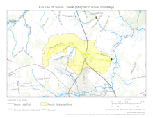 Swan Creek drains 5.09 square miles (13.2 km2) of area, receives about 45.7 in/year of precipitation, has a topographic wetness index of 555.50 and is about 8.8% forested.[4]