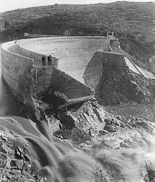 One of the area's early settlers, Frank Kimball, was the first to suggest the building of a dam on this particular reach of the Sweetwater River in 1869.[4] Here the river after departing a broad valley cuts through a steep and narrow gorge, providing an ideal site for a reservoir. The original blueprints for the dam, drawn by a F. E. Brown, called for a thin-arch dam 50 feet (15 m) high and barely wider on its crest than at its base, capable of holding some 3,700 acre feet (4,600,000 m3). Groundbreaking of the dam was on November 17, 1886 and a quarry was excavated on the south side of the gorge early the following year to provide masonry rubble for the dam.[7][8]