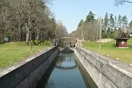 Swoboda Lock is the seventh lock on the Augustów Canal (from the Biebrza). It is situated amidst the Augustów Forest near Lake Studzieniczne. Built between 1826 and 1827 by Lt.-Col. Eng. Jan Paweł Lelewel. In the 1960s has undergone modernization involving the replacement of original wooden gates with metal crank-driven mechanism raised, reinforced concrete bridge was built a distinctive and concreting awanportu. New system to move the gates did not work and was later by one of the membranes removed, and replaced the original system of drawbars.