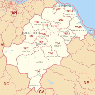 The TD postcode area, also known as the Galashiels postcode area,[2] is a group of fifteen postcode districts in south-east Scotland and the far north-east of England, within seventeen post towns. These cover most of the Scottish Borders council area (including Galashiels, Lauder, Gordon, Earlston, Kelso, Melrose, Selkirk, Jedburgh, Hawick, Newcastleton, Duns, Coldstream, Cockburnspath and Eyemouth) and the northernmost part of Northumberland (including Berwick-upon-Tweed, Cornhill-on-Tweed and Mindrum), plus a part of south-eastern East Lothian and a very small part of Cumbria.