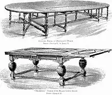 Furniture during the Middle Ages is not as well known as that of earlier or later periods, and most sources show the types used by the nobility. In the Eastern Roman Empire, tables were made of metal or wood, usually with four feet and frequently linked by x-shaped stretchers. Tables for eating were large and often round or semicircular. A combination of a small round table and a lectern seemed very popular as a writing table.[6] In western Europe, the invasions and internecine wars caused most of the knowledge inherited from the classical era to be lost. As a result of the necessary movability, most tables were simple trestle tables, although small round tables made from joinery reappeared during the 15th century and onward. In the Gothic era, the chest became widespread and was often used as a table.