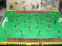 - The player figures may each be on a weighted or magnetic base, so that one can be flicked across the flat field to strike the ball (which may actually be a disc or a non-spherical object similar to polyhedral dice) and drive it to the goal between the opposing player's figures.[1] Each player's goalkeeper (in forms of football with that role) is independently movable on a stick, usually in an arc but sometimes in a straight slot, to block incoming shots. Subbuteo is the best-known brand of this sort of game, using tiny models of human players. A competitive sport in its own right, sports table football, has developed around this style of game equipment. A variation among the movable-piece games has figures whose heads can be pressed down to fire a spring-loaded kick with a moving leg.[2] Button football uses colored disks instead of figurines; game play is similar to that of carrom and various related games with a disk-flicking action but without a team-sports theme.