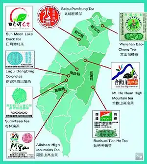 Taiwanese tea includes four main types: oolong tea, black tea, green tea and white tea. The earliest record of tea trees found in Taiwan is from 1717 in Shui Sha Lian (水沙連), present-day Yuchi and Puli, Nantou County.[1] Some of the teas retain the island country's former name, Formosa.
