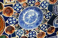 Talavera pottery (Spanish: Talavera poblana) is a Mexican and Spanish pottery tradition from Talavera de la Reina, in Spain. The Mexican pottery is a type of majolica (faience) or tin-glazed earthenware, with a white base glaze typical of the type.[1] It comes from the town of San Pablo del Monte (in Tlaxcala) and the cities of Puebla, Atlixco, Cholula, and Tecali (all these four latter in the state of Puebla), because of the quality of the natural clay found there and the tradition of production which goes back to the 16th century.[2] Much of this pottery was decorated only in blue, but colors such as yellow, black, green, orange and mauve have also been used.[3] Majolica pottery was brought to Mexico by the Spanish in the first century of the colonial period. Production of this ceramic became highly developed in Puebla because of the availability of fine clays and the demand for tiles from the newly established churches and monasteries in the area. The industry had grown sufficiently that by the mid-17th century, standards and guilds had been established which further improved the quality, leading Puebla into what is called the "golden age" of Talavera pottery (from 1650 to 1750).[2] Formally, the tradition that developed there is called Talavera Poblana to distinguish it from the similarly named Talavera pottery of Spain. It is a mixture of Italian, Spanish and indigenous ceramic techniques.[1]