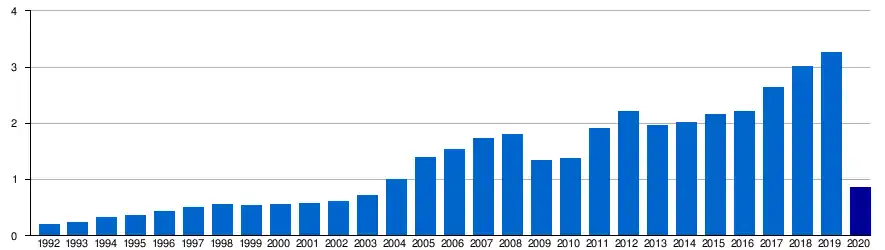 Total passengers using the airport has increased on average by 14.2% annually since 1998. On 16 November 2012 Tallinn Airport has reached two million passenger landmark for the first time in its history.[97] Passenger data reflects international and domestic flights combined, share of domestic flights compared to international flights was marginal. Passenger and cargo numbers exclude direct transit.[3]