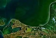 The Taman Bay (Russian: Таманский залив) is a shallow bay or gulf on the east coast of the Strait of Kerch shaped by the Tuzla and Chushka spits. It dips into the Taman Peninsula of Krasnodar Krai, Russia for about 16 km. The bay is 8 km wide at its mouth and is up to 5 metres deep. Fishing villages and the old townlet of Taman afford fine views of the bay. It is full of islets. Freezing normally begins in mid-December and continues until March.