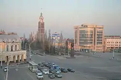 The city's layout began to change after 1781. As part of the redevelopment of the Russian cities at the 18th century the new system of provincial cities was to be embodied in their newest appearance - in the spatial and architectural order, expressed in geometric correctness and regularity of the international style of classicism, in contrast to the previously existing picturesque structure, which began to be perceived as a mess.[18] The general plan of Tambov was approved on December 9, 1781 by Catherine II. The urban planning document was aimed at clearing the urban space of old, random buildings, freely located, and creating an ordered grid-structure with geometrically regular lines of houses and straight streets. In 1781, Governor-General Roman Illarionovich Vorontsov was invited to Tambov from St. Petersburg to the newly opened position of the provincial architect from the "soldiers' children" of the collegiate registrar Vasily Antonovich Usachev, who became the coordinator of the implementation of Tambov's urban planning plan. The streets of the city center were based on the old roads that formed around the fortifications of the fortress, erected in 1636 under the governor Roman Boborykin. The central axis of the foundation of the oldest building in Tambov, the Transfiguration Cathedral now does not fit into the regular plan of the central part of Tambov, recalling the initial originality of the space of the fortified city.[18] A number of longitudinal streets appeared: First and Second Dolgie (Dolovye Streets) and Obvodnaya, which along the river valley. Rzhavets circled the western part of the city. From Tambov there were roads to Penza and the district towns of Kozlov, Morshansk, Lipetsk. Streets sprout along these roads. Kuzminskaya Street led out through the village. Kuzminka on the Astrakhan tract. Noblemen settled on the central cross street. The street is named Shirokaya Dvoryanskaya. In the shopping districts of the city, Khlebnaya Square was formed, it is bordered by Khlebnaya and Muchnaya streets. Near Sennaya (later Bazaar) squares are formed from the east by Proyezhaya, and from the west - by Vyez'zhaya streets. The outskirts of the streets were inhabited by petty officials – clerks and odnodvorets, which was reflected in their names. The southern part of the city was built up at the beginning of the 19th century. New, First, Second, Third, Fourth, Fifth streets appear here, and later - Kirpichnaya, Kamennaya and Invalidnaya streets.[19]