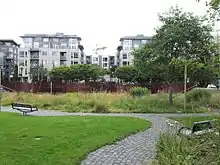 Connected to the busy Jamison Square two blocks away by a wooden boardwalk made of ipê, Tanner Springs Park is quiet and naturalistic, designed by Atelier Dreiseitl and GreenWorks PC.[3][6][7] Stripping away the industrial cover helped reconnect the neighborhood with the pre-industrial wetlands, especially Tanner Creek, which ran through the area.[2][7] The New York Times described it as "a sort of cross between an Italian piazza and a weedy urban wetland with lots of benches perched beside gently running streams."[8] The waterscape was designed by architect Herbert Dreiseitl, who spent time perfecting the sound made by the rushing water.[7] The park is planted with tall native grasses, and includes Oregon oak, red alder and bigleaf maple trees, salvaged in the region and planted as mature trees.[9]