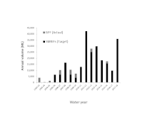 The SWIOID 2002 identifies a target of 27GL (i.e. 30% of the Mean Annual Natural Flow- MANF) in a full allocation scenario. Since 2005-06, environmental water has been released to the Upper Murrumbidgee River to repair the condition of the river. Over the period 2005 to 2018, an average of 17.7GL/year of environmental water has been released to the upper Murrumbidgee River. The annual allocation varied between 4 GL/ year during the drought and 42.3 GL /year once sufficient water had been recovered.[5]