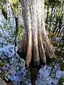 Bald cypress trees growing in swamps have a peculiarity of growth called cypress knees. These are woody projections from the root system project above the ground or water. Their function was once thought to be to provide oxygen to the roots, which grow in the low dissolved oxygen waters typical of a swamp (as in mangroves). However, evidence for this is scant; in fact, roots of swamp-dwelling specimens whose knees are removed do not decrease in oxygen content and the trees continue to thrive. Another more likely function is structural support and stabilization. Bald cypress trees growing on flood-prone sites tend to form buttressed bases, but trees grown on drier sites may lack this feature. Buttressed bases and a strong, intertwined root system allow them to resist very strong winds; even hurricanes rarely overturn them.[6]