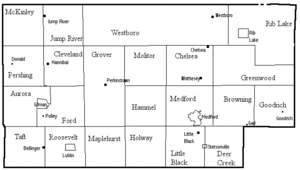 In 1875 Taylor County with its current boundaries was carved out of the larger Chippewa, Lincoln and Clark counties and a bit of Marathon, with the county seat at Medford. The county was probably named for Wisconsin's governor at the time, William Robert Taylor. At the time virtually all of Taylor County's inhabitants were Yankee migrants from New England, which influenced the naming of the county, as William Robert Taylor was from Connecticut of English descent.[12][13] It was initially divided into four towns—Westboro, Chelsea, Medford and Little Black[14]—each stretching the width of the county.[15]