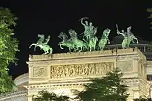 The building is an important example of Neoclassical architecture.[1] It has a large entrance by way of triumphal arch topped by the bronze quadriga designed by Mario Rutelli. This quadriga depicts the "Triumph of Apollo and Euterpe" flanked by two statues of knights on horseback, representation of the "Olympic Games", work of Benedetto Civiletti.[1] On both sides of the entrance there are commemorative plaques recording the epigraphs dictated by the historian Isidoro La Lumia.[1] At the top there are two bass reliefs depicting the "Fames" draw by the painter Giuseppe Pensabene and another, under the quadriga, depicting little angels, work of Mario Rutelli.[1]