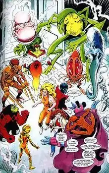 Later, the Technet traveled on business to the Wereworlds, whose natives become werewolves under a full moon, having been exiled from their home by Sat-Yr-9. Here Elmo, a member of the Technet, was fatally wounded by werewolves. Subsequently, Gatecrasher either seriously injured or killed a member of the 'Berserker Pirates' who attempted to interest her in becoming his lover. The pirate's family forced the Technet to turn over all their accumulated wealth as reparations. Angered by this reversal in their fortunes, all of the members of the Technet except for Yap and Fascination left the team.