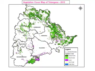 The government has launched a scheme, Haritha Haram,[1] to make the entirety of Telangana green.[2] Telangana government has decided to launch a massive tree plantation programme to bring entire Telangana under green cover in the next three years. It is estimated that the entire Telangana state requires 210 crore saplings to bring 33 per cent of the area under green cover.[3]
