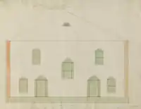Make your house fourteen feet high between the floors. There will not be a gallery but a chamber; each story to be fourteen feet high, arched overhead with an elliptic arch. Let the foundation of the house be of stone; let it be raised sufficiently high to allow of banking up so high as to admit of a descent every way from the house, so far as to divide the distance between this house, and the one next to it. On the top of the foundation, above the embankment, let there be two rows of hewn stone, and then commence the brick-work on the hewn stone. The entire height of the house is to be twenty-eight feet, each story being fourteen feet; make the wall a sufficient thickness for a house of this size. The end view represents five windows of the same size as those at the side, the middle window excepted, which is to be the same, with the addition of side lights. This middle window is designed to light the rooms both above and below, as the upper floor is to be laid off in the same way as the lower one, and arched overhead; with the same arrangement of curtains, or veils, as before mentioned. The doors are to be five feet wide, and nine feet high, and to be in the east end of the house. The west end is to have no doors, but in other respects is to be like the east, except the windows are to be opposite the alleys which run east and west. The roof of the house is to have one-fourth pitch, the door to have Gothic top, the same as the windows. The shingles of the roof to be painted before they are put on. There is to be a fanlight, as you see. The windows and doors are all to have venetian blinds. A belfry is to be in the east end, and a bell of very large size.[16]