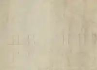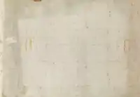 On February 4, 1927, Otto Fetting, an apostle of the Church of Christ (Temple Lot), claimed that John the Baptist had visited him at his home as an angel and urged construction of a temple on the Temple Lot.[26] Fetting's claim was officially endorsed by the leading quorum of the church and by most of the laity,[27] and ground was broken on April 6, 1929, with instructions that the temple was to be completed within seven years.[2] The proposed structure was to be 180 feet (55 m) in length 90 feet (27 m) in width.[2] After staking out a portion of the ground, an angel allegedly appeared and stated that "[t]he building that you have staked is ten feet too far east, and if you will move the stakes then it shall stand upon the place that has been pointed out by the finger of God."[2] Excavations revealed the stones originally buried by Joseph Smith, in line with the survey markers.[28] These two stones are currently in the Temple Lot headquarters building, while their original position is marked by two other engraved stones embedded visibly in the lot. The outer corners of the temple are presently marked by similar stones.