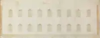 The house of the Lord for the Presidency, is eighty-seven feet long and sixty-one feet wide, and ten feet taken off of the east end for the stairway, leaves the inner court, seventy-eight feet by sixty-one, which is calculated and divided for seats in the following manner, viz: the two aisles four feet wide each; the middle block of pews are eleven feet ten inches long, and three feet wide each; and the two lines drawn through the middle are four inches (102 mm) apart; in which space a curtain is to drop at right angles, and divide the house into four parts if necessary. The pews of the side blocks are fourteen and a half feet long, and three feet wide. The five pews in each corner of the house, are twelve feet six inches long. The open spaces between the corner and side pews are for fireplaces; those in the west are nine feet wide, and the east ones are eight feet and eight inches (203 mm) wide, and the chimneys carried up in the wall where they are marked with a pencil.