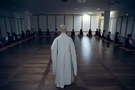 Seon meditation (chamseon) is similar to other forms of meditation. However, it does differ in one particular respect and that is that chamseon’s goal is to achieve single-minded absorption through the illogical doubt raised by a hwadu (the punch-line to a koan) so that the rambling mind is momentarily quieted. It is one of the most important practices of Korean Buddhism. A chamseon session usually consists of 50 minutes of Seon meditation followed by 10 minutes of slow and fast walking (pohaeng or gyeonghaeng). Depending on the temple and the program, longer or shorter periods of meditation are offered in which participants learn the aim and method as well as correct posture.[18]