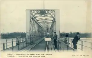 The first bridge across the Schelde at Temse was ready for use on 30 November 1870. It was designed by the French engineer Gustave Eiffel. Eifffel's 343 m (1,125.3 ft) bridge was primarily a railway bridge, carrying the line from Mechelen to Terneuzen. However, beside the railway line, on each side of it, was a toll path for pedestrians and their animals.[3] Tolls were set in 1872 at 15 centimes for a horse or cow, 10 centimes for a donkey, 5 centimes for a person and 3 centimes for one goat or two ducks. Later in the century, the bridge was also used by small horse carts and dog carts. Towards the end of the century motor cars began to appear on the streets, but anyone wishing to cross the river with a car had to drive upstream to Dendermonde.[3]