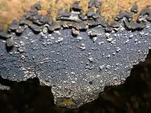 Terana caerulea is resupinate, meaning the fruiting body lies on the surface of the substrate, with the hymenium exposed to the outside. The fruiting body is 2–6 mm thick.[3] It is dark blue with a paler margin, with a velvety or waxy texture when moist, but crusty and brittle when dry. The fruiting body is firmly attached to its growing surface except at the edges. In nature, the fungus surface is typically found pointing downward, which helps facilitate spore dispersal. It usually grows on dead deciduous wood, often ash and hazel.[4] The spore print is white.[3] Spores are ellipsoidal, smooth, thin-walled, hyaline or pale blue, with dimensions of 7–12 by 4–7 µm.[5] The four-spored basidia are club-shaped, hyaline or blue, with dimensions of 40–60 by 5–7 µm.[5]