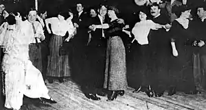The Thalia opened in 1911, and with a team of six bartenders and over 100 female employees became the largest of the dance halls on Pacific Street.[36] From its start the Thalia received much support from the police department and was allowed stay open until 3 AM, which was way past the 1am curfew that the other dance halls had to abide by.[36] The Thalia was located in a large barn-sized building which had double-tiered slummers' balconies for its many spectators.[4] It had a large rectangular dance floor, an 18-piece orchestra, and also had a smaller band which played on the sidewalk to lure in customers.[37] Dances such as the Texas Tommy and Turkey Trot which became popular across the country, most likely originated in the Thalia or possibly Purcell's. The Thalia was often described as the place where the new dances came from.[37] Differing from Purcell's by its large size and having slummers' balconies, the Thalia was possibly the place where middle-class San Franciscans got their first look at the new ragtime dance steps, like the Texas Tommy and Turkey Trot. Texas Tommy was described as the most prominent dance of the time, and it later spread across the country.