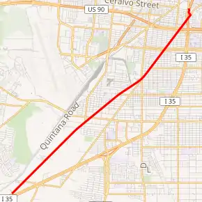 Loop 353 begins on the southwest side of San Antonio at I-35 just northeast of I-410 interchange. The loop heads northeast along New Laredo Highway, roughly paralleling the interstate for its entire routing. The road continues towards the northeast, intersecting Loop 13 (Military Drive). The highway is the southeast boundary and provides access to Kelly USA, the former Kelly Air Force Base. At an intersection with Zarzamora Street, the street name changes to Nogalitos Street. The highway continues to the northeast and has a junction with US 90 just prior to its northern terminus at I-10 and I-35.[5]