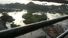 The Thamirabarani River originates from the peak of the Pothigai hills on the eastern slopes of the Western Ghats at an elevation of 1,725 metres (5,659 ft) above sea-level. The river is joined by its headwater tributaries Peyar, Ullar, Pambar before it flows into the Karaiyar Dam reservoir, where it meets Karaiyar. The river forms the Paanatheertham waterfalls, 40 metres (130 ft) high, as it enters the Kariyar reservoir.[16] Servalar joins the Thamirabarani before it enters into the Papanasam lower reservoir, which was built for the Papanasam Hydroelectric station.[17] The river descends down the mountains near Papanasam, where it forms the Kalyanatheertham falls and Agasthiar falls.[18][19]