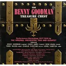 The Benny Goodman Treasure Chest is a jazz album by Benny Goodman, released in 1959.[1] This three-LP Record Box Set was released by MGM Records These are Performance Recordings 1937–1938 by the original orchestra, trio, and quartet featuring Benny Goodman (clarinet) with Harry James/Ziggy Elman/Chris Griffin (trumpet), Murray McEachern/Red Ballard/Vernon Brown (trombone), Lionel Hampton (vibes), Teddy Wilson/Jess Stacy (piano), Hymie Shertzer/Vido Musso/Jerry Jerome/George Koenig/Dave Matthews/Arthur Rollini/Babe Russin (sax), Harry Goodman/Artie Bernstein (bass), Charlie Christian/Allan Reuss (guitar) and Gene Krupa/Dave Tough/Nick Fatool (drums).