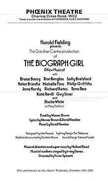 Produced by Harold Fielding, directed by Victor Spinetti, and choreographed by Irving Davies, the musical premiered at the Phoenix Theatre in the West End on 19 November 1980 and closed after 57 performances.[1] The cast included Sheila White as Mary Pickford, Bruce Barry as D.W. Griffith, Kate Revill as Lillian Gish, Guy Siner as Mack Sennett, and Ron Berglas as Adolph Zukor.[2]