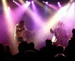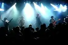 They have played headlining gigs in small indie venues as well as supporting big acts such as REM[10] and Siouxsie & the Banshees on major international tours, frontman Gerard Langley always wearing his trademark shades even at night in dark venues.[11] Performances include the band's 1992 appearance at Glastonbury which was broadcast on BBC Radio 1,[12] the finale at the Hammersmith Apollo when 12 guitarists were seen on stage performing "Breaking in My Heart" and their annual appearance at Fiddlers in Bristol[13] which has now been relocated to the band's own venue, The Fleece.[14]
